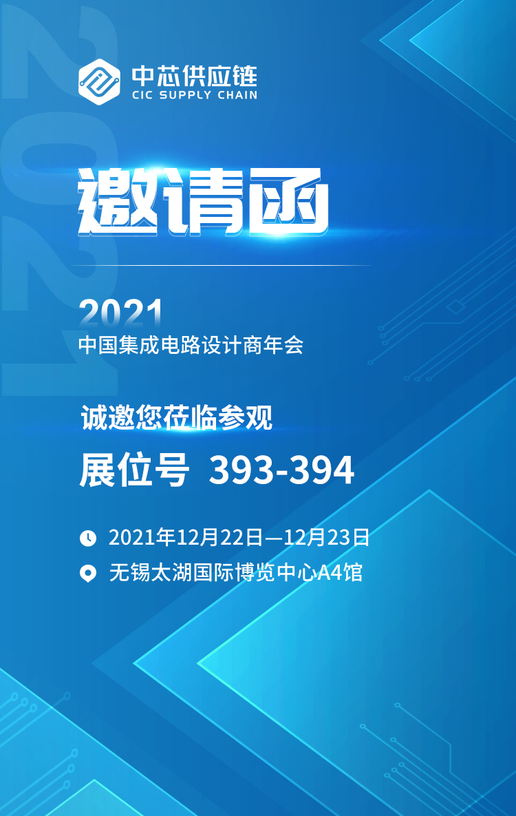 2021中国集成电路设计商年会将于 12月22日-23日,在无锡太湖国际博览中心举行。中芯供应链诚邀您莅临我司展位交流、休憩。