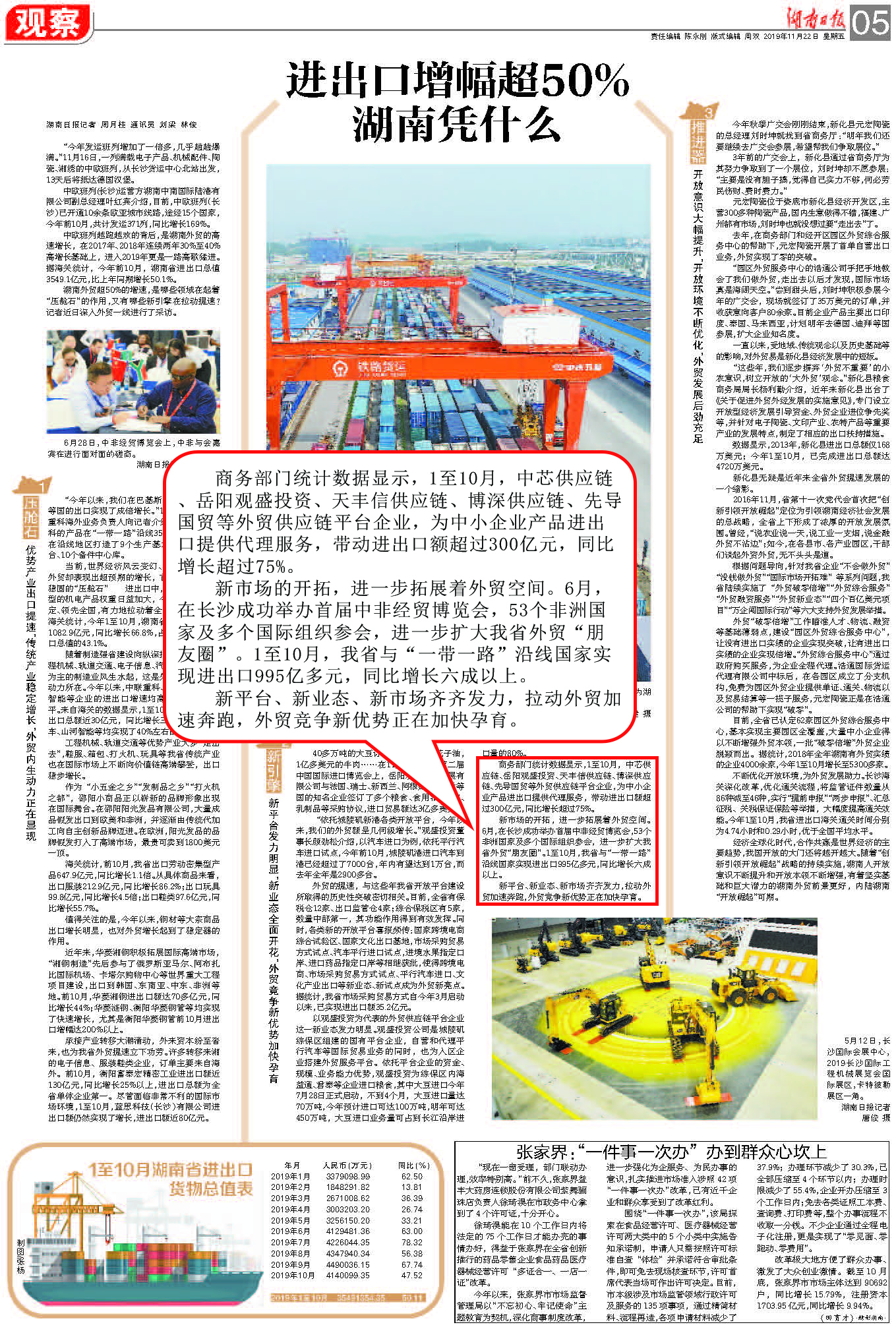湖南外贸进入2019年一路高歌猛进,前10月进出口增速超过50%。不沿海、不沿边的湖南,凭什么?