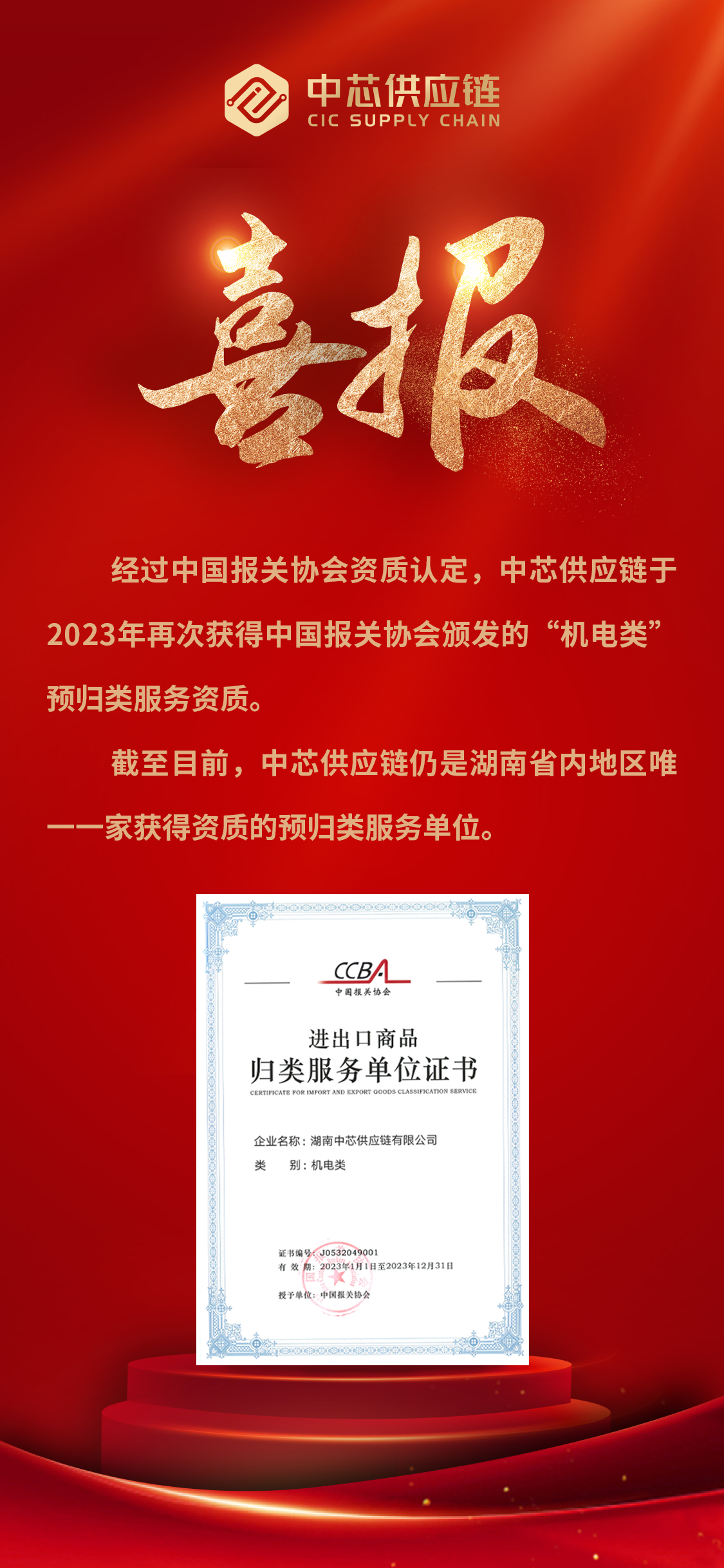 中芯供应链再次荣获湖南省内首个预归类服务资质单位