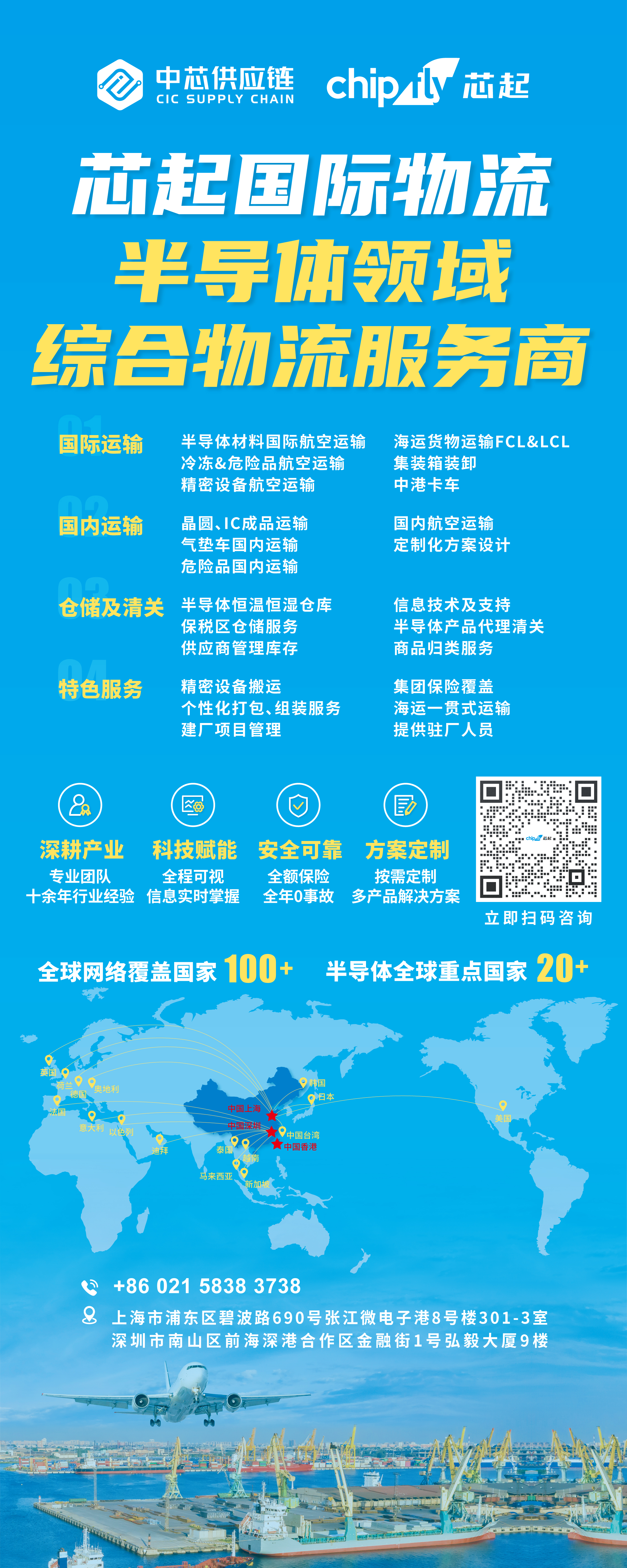 芯起国际物流作为诞生于中芯供应链这家具备深厚供应链服务行业经验的企业,传承了精心服务好每一位客户,为助力客户成长不遗余力的精神。并利用自身实力过硬的专业团队以及丰富的全球物流网络,专注为半导体领域企业提供安全可靠、可定制化的国内外物流服务。